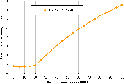 Отличный результат — почти линейный рост скорости вращения при изменении коэффициента заполнения от 20% до 100%, диапазон регулировки скорости вращения достаточно широкий. При снижении коэффициента заполнения (КЗ) до 0 вентиляторы не останавливаются. Это может иметь значение, если пользователь хочет создать гибридную систему охлаждения, которая при низкой нагрузке работает полностью или частично в пассивном режиме.