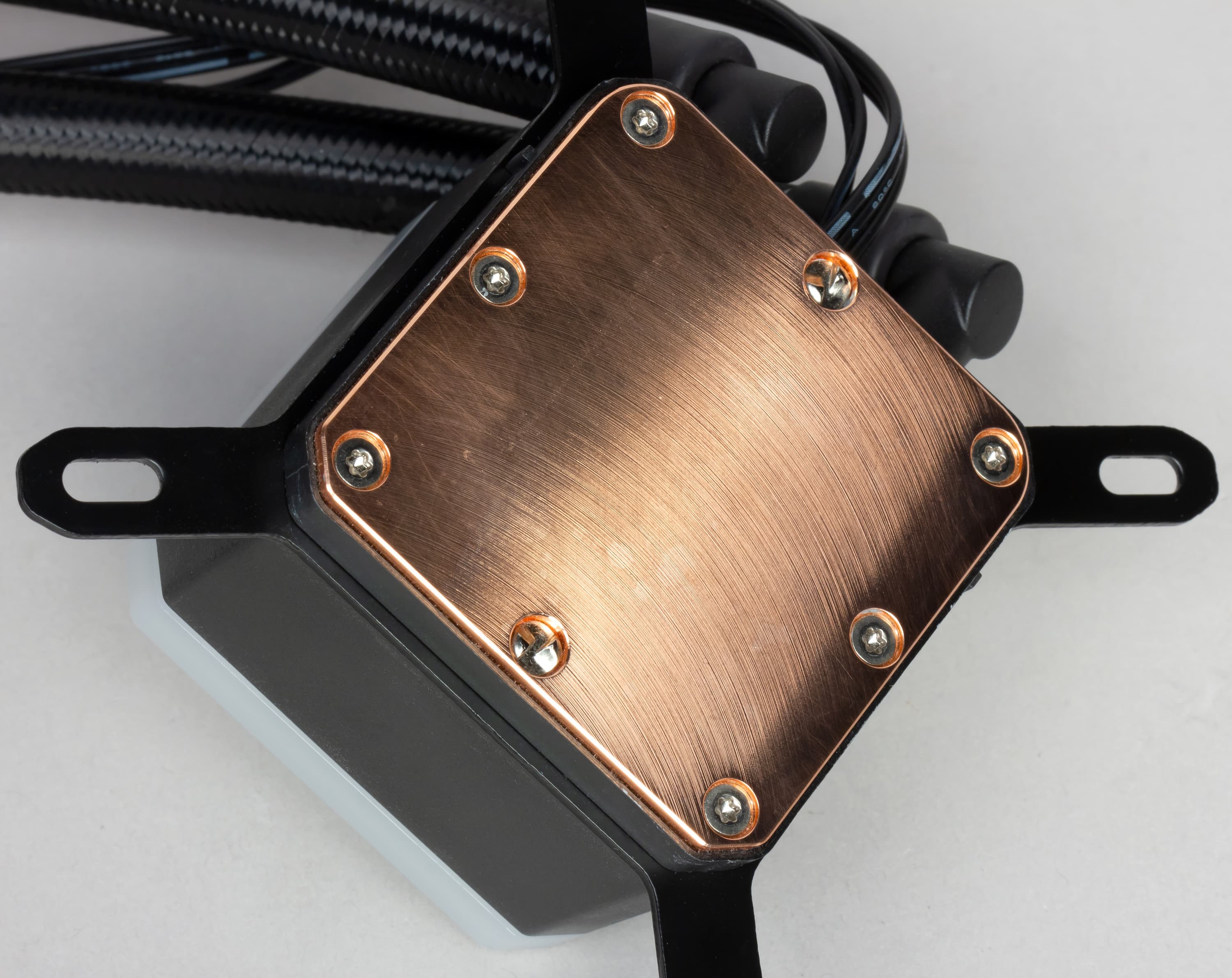 Система герметичная, заправлена, готова к использованию. Помпа интегрирована в один блок с теплосъемником. Подошвой теплосъемника, непосредственно прилегающей к крышке процессора, служит медная пластина. Ее внешняя поверхность шлифованная и слегка полированная, она практически идеально плоская.