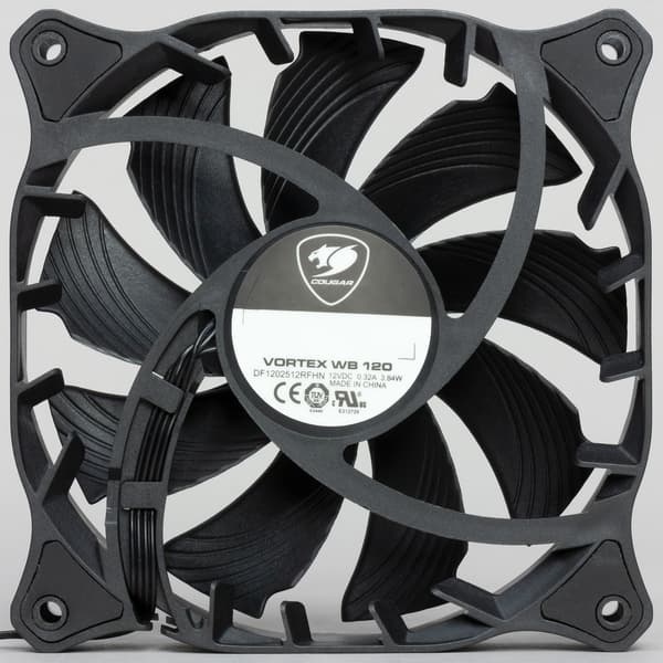 Типоразмер комплектных вентиляторов 120 мм. На проушины рамки вентилятора наклеены накладки из резины. Эти упругие элементы по идее должны снижать шум от вибрации, но на практике ничего этого не будет, так как масса вентилятора и жесткость виброгасящих элементов позволяют обоснованно предположить, что из-за высокой резонансной частоты эта система в любом случае не будет иметь сколь либо значимых антивибрационных свойств. К тому же крепежные винты упираются в саму рамку вентилятора, эти жесткие связи вообще исключают какую-либо виброразвязку даже в теории. Но хотя бы исключен вариант дребезга из-за неплотного прилегания.