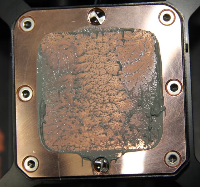 Габариты этой пластины — 56×56 мм, а внутренняя часть, ограниченная отверстиями — 43×43 мм. Термопаста — в маленьком шприце, что, конечно, менее удобно, чем преднанесенный слой. Комплектного запаса термопасты должно хватить раза на два в случае процессоров с небольшой площадью крышки. Во всех тестах использовалась термопаста другого производителя, расфасованная в шприц и чуть более жидкая. Забегая вперед, продемонстрируем распределение термопасты после завершения всех тестов. На процессоре (Intel Core i9-7980XE):
