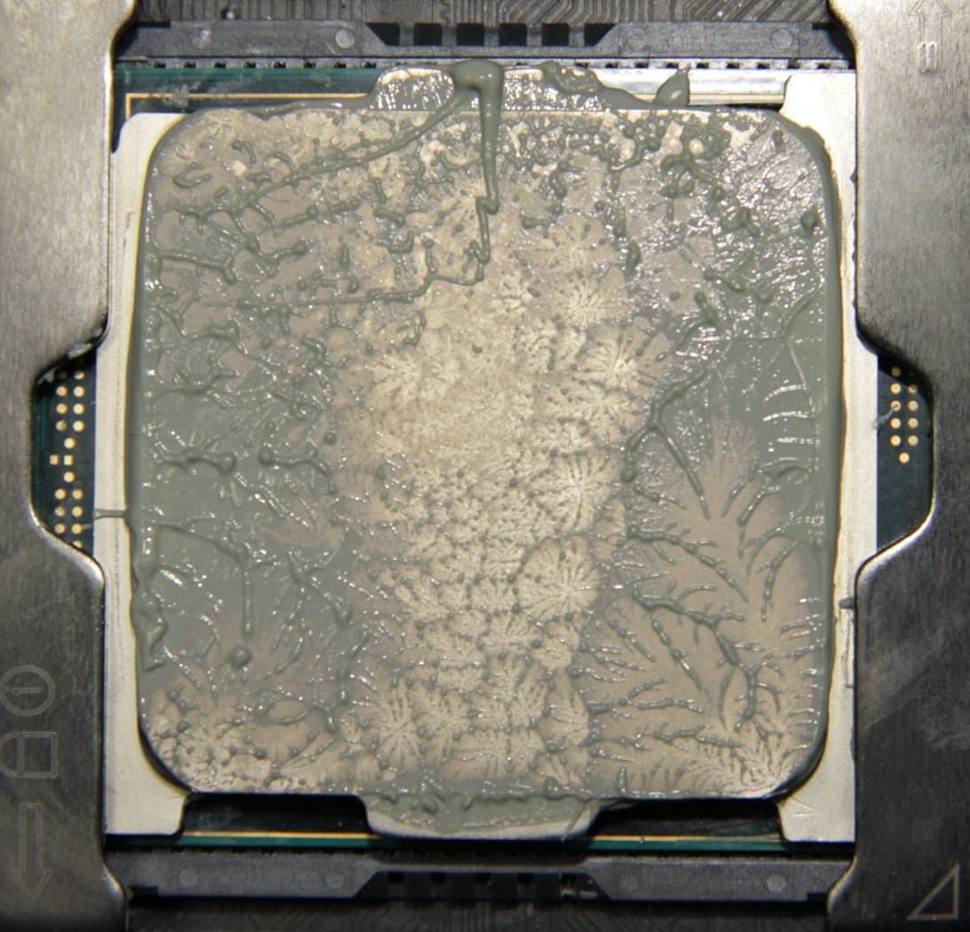 Видно, что термопаста распределилась очень тонким слоем на большей части (и главное в центре) площади крышки процессора, а ее избытки выдавились за края. Участок плотного контакта имеет большую площадь.