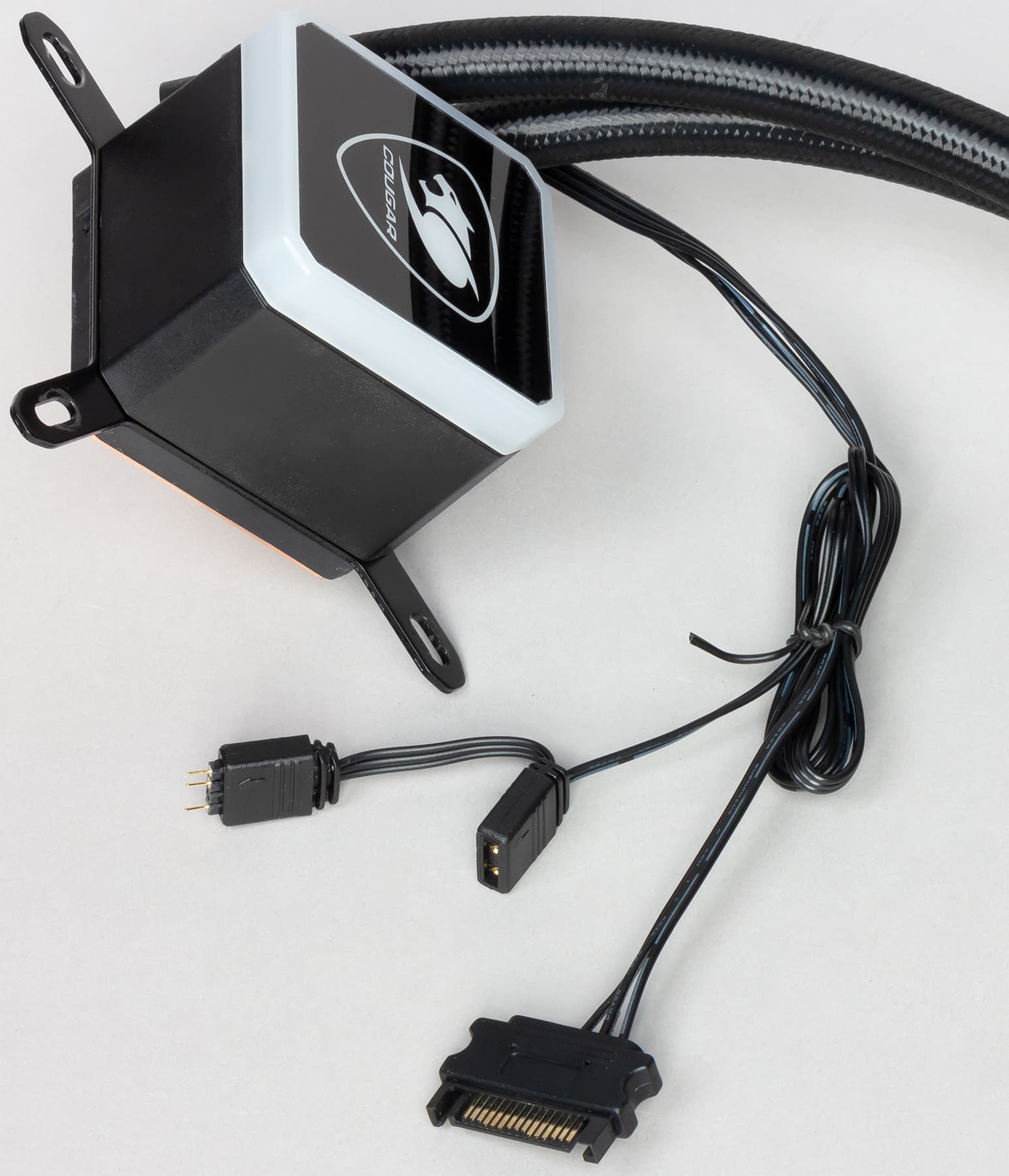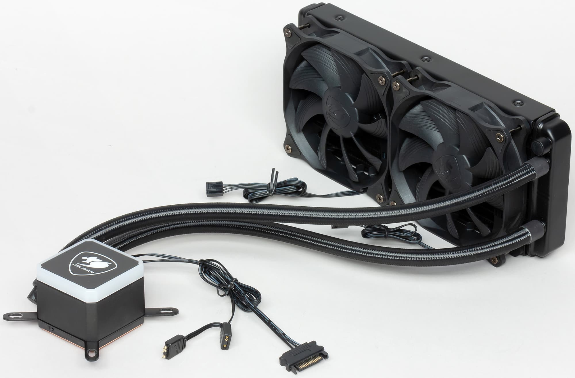 На основе системы жидкостного охлаждения Cougar Aqua 240 можно создать условно бесшумный компьютер (уровень шума 25 дБА и ниже), оснащенный процессором типа Intel Core i9-7980XE (Intel LGA2066, Skylake-X (HCC)), если потребление процессора под максимальной нагрузкой не будет превышать 220 Вт, а температура внутри корпуса не повысится выше 44 °C. При снижении температуры охлаждающего воздуха и/или менее жестких требованиях к уровню шума пределы мощности можно существенно увеличить. Любители моддинга оценят многоцветную и многозонную подсветку помпы, которой можно управлять с помощью РЧ-пульта ДУ или с помощью внешнего контроллера/системной платы, используя стандартное трехконтактное подключение для адресуемой подсветки. Отметим хорошее качество изготовления, оплетку шлангов (как минимум помогающую сохранить единый стиль оформления внутренностей компьютера), довольно длинные шланги, подключение помпы к разъему питания SATA, прочную рамку на обратную сторону системной платы. К недостаткам отнесем отсутствие возможности отслеживать скорость вращения помпы и цепляющиеся за рамку пружины на гайках. Второе можно исправить, подложив под пружины шайбы.