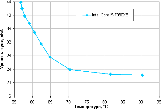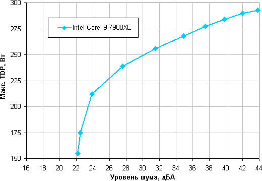 Приняв 25 дБА за критерий условной бесшумности, получим примерную максимальную мощность процессора, соответствующую этому уровню. Это порядка 220 Вт для процессора Intel Core i9-7980XE. Если не обращать внимания на уровень шума, то пределы мощности можно увеличить где-то до 290 Вт. Еще раз уточним: это в жестких условиях обдува радиатора нагретым до 44 градусов воздухом, а при снижении температуры воздуха указанные пределы мощности для бесшумной работы и максимальной мощности возрастают.