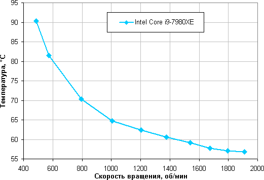 Формально в этом тесте наш процессор Intel Core i9-7980XE при 24 градусах окружающего воздуха не перегревается даже на минимальных оборотах вентиляторов в случае регулировки с помощью только ШИМ. Можно даже понизить напряжение питания вентиляторов до 10 В (первая точка), но температура при КЗ = 20% и 10 В уже близка к критической.