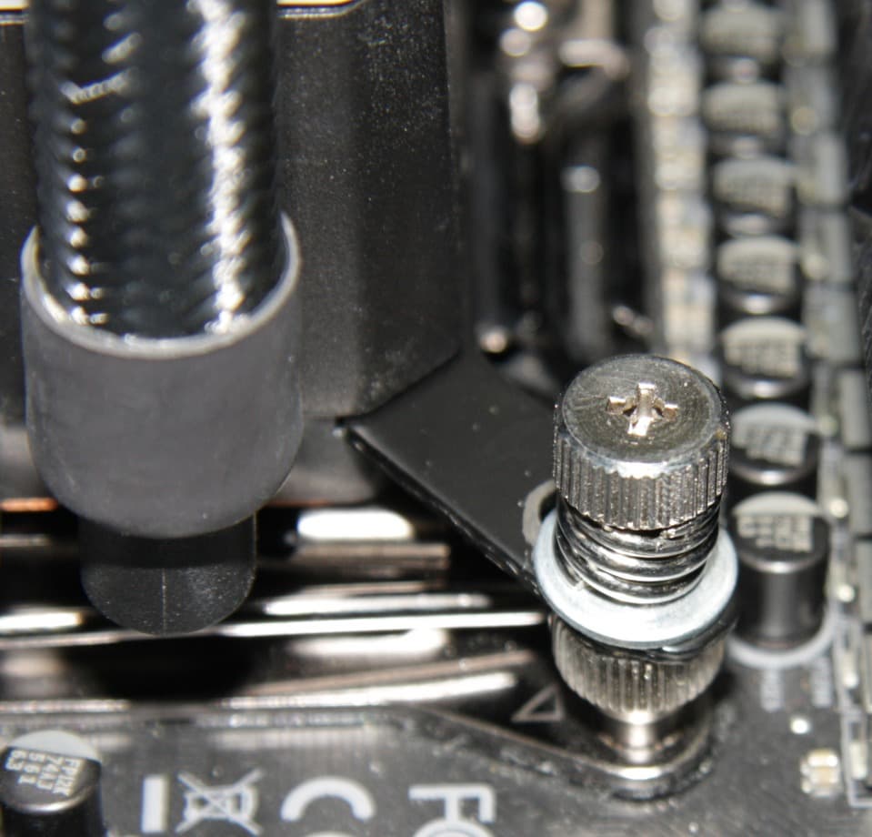 Крепеж изготовлен в основном из закаленной стали и имеет стойкое гальваническое покрытие (винты, гайки стойки) или черное полуматовое лакокрасочное покрытие (рамки, винты с проушиной). Крепежные рамки просто вставляются в пазы на помпе, это очень удобно, но нужно следить, чтобы при закреплении водоблока на процессоре, водоблок не сместился в сторону. Рамка на обратную сторону системной платы изготовлена из стали толщиной 2 мм и усилена элементами жесткости. Это снижает вероятность деформации системной платы. Во время тестов выяснилось, что при закручивании и особенно при откручивании гаек с пружиной, пружина цепляется за паз в крепежной рамке. Ситуацию исправляют подложенные широкие шайбы с отверстием 4 мм, как на фотографии ниже, но где их взять – забота самого пользователя.