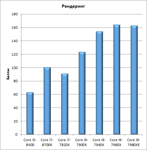 Как известно, задачи рендеринга очень хорошо распараллеливаются: для них чем больше ядер, тем лучше. Но это лишь в том случае, если тактовая частота остается неизменной. В реальности же при увеличении числа ядер с одновременным уменьшением их тактовой частоты может получиться и проигрыш в производительности. В частности, процессор Core i9-7980XE демонстрирует результат даже немного ниже, чем процессор Core i9-7960X.
