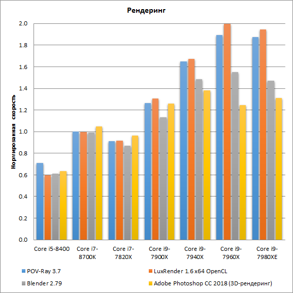 Если говорить конкретно по приложениям, то в POV-Ray, LuxRender и Blender наилучший результат демонстрирует процессор Core i9-7960X, а в Adobe Photoshop — процессор Core i9-7940X.