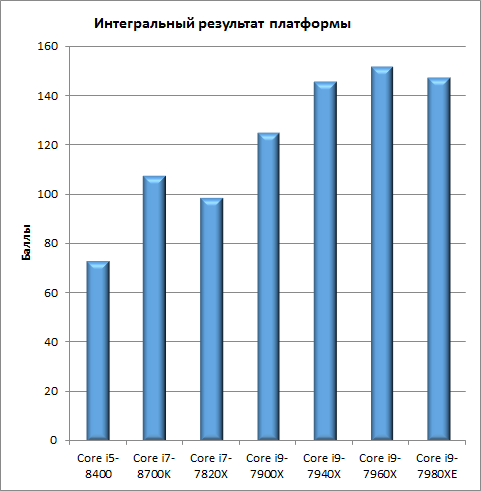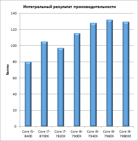 По интегральному результату производительности в данном тесте все так, как и должно быть. Самый высокий результат (в баллах) демонстрирует топовый процессор Core i9-7980XE.