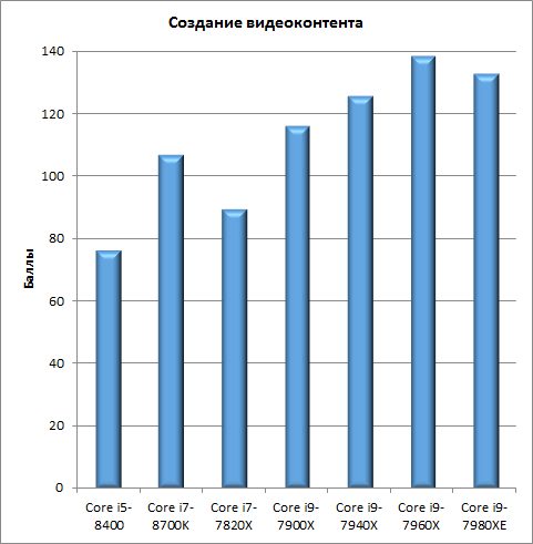 По интегральному результату производительности в группе «Создание видеоконтента» ситуация почти такая же, как в предыдущем случае, то есть лидирует процессор Core i9-7960X, который демонстрирует результат даже немного выше, чем Core i9-7980XE.