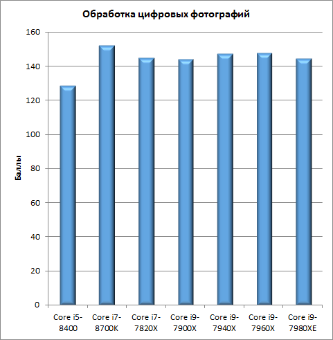 Пожалуй, результаты тестирования в группе «Обработка цифровых фотографий» самые интересные. Во-первых, по интегральному результату на первом месте здесь процессор Core i7-8700K. Во-вторых, для всех процессоров семейства Core-X результат получается примерно одинаковый. И в третьих, сравнивая результаты для системы на базе процессора Core i7-8700K с результатами референсной системы, можно сделать вывод, что результаты сильно зависят от GPU, то есть с видеокартой MSI GeForce GTX 1070 Gaming X 8G интегральный результат получается существенно лучше, чем с процессорным графическим ядром Intel UHD 630.