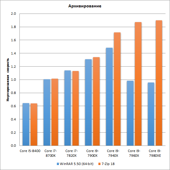 Для процессора Core i9-7940Х нормированные скорости еще выше, но уже не равны друг другу: в тесте на основе приложения 7-Zip скорость выше, чем в тесте на основе приложения WinRAR.