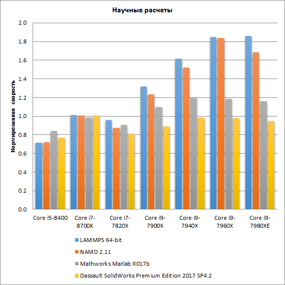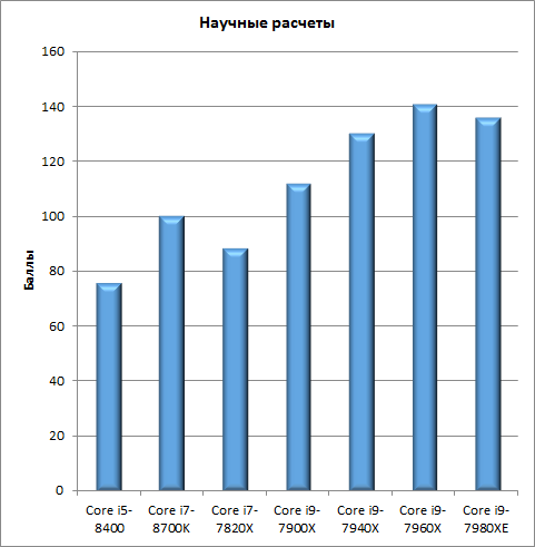 По интегральному результату производительности в группе «Научные расчеты» наилучший результат демонстрирует процессор Core i9-7960X, у которого результат чуть выше, чем у процессора Core i9-7980XE.