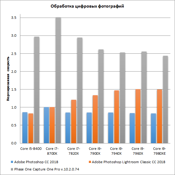 В группу «Обработка цифровых фотографий» входят три теста на основе приложений Adobe Photoshop СС 2018, Adobe Photoshop Lightroom Classic СС 2018 и Phase One Capture One Pro v.10.2.0.74. Во всех тестах используется пакетная обработка 100 фотографий в формате RAW, сделанных камерой Canon EOS 5D Mark III. Разрешение каждой фотографии составляет 3840×5760.
