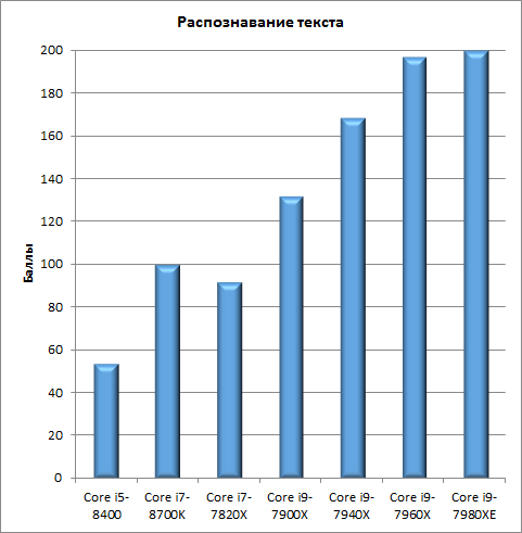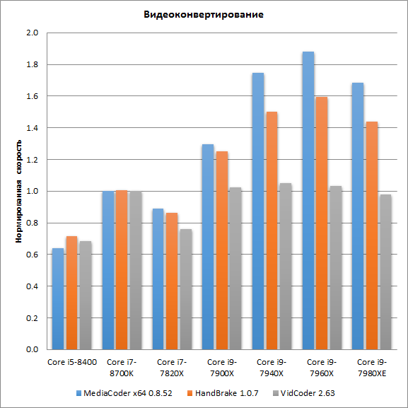 Интересно, что в тесте на основе приложений VidCoder результаты для процессоров Core i7-8700K, Core i9-7940X, Core i9-7960X, Core i9-7980XE получаются практически одинаковыми.
