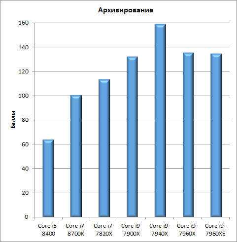 По интегральному результату производительности в группе «Архивирование» наилучший результат демонстрирует процессор Core i9-7940X. Но это именно интегральный результат по двум тестам, поскольку в разных тестах результаты отличаются.