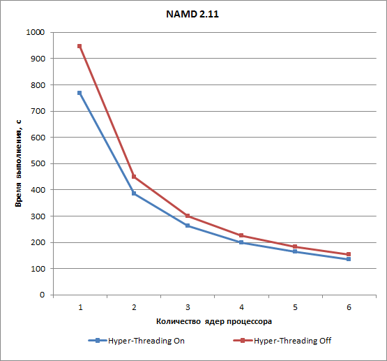 Для теста на основе приложения NAMD 2.11 использование технологии Hyper-Threading сокращает время расчета на 19% в случае одного ядра и примерно на 12% в остальных случаях.