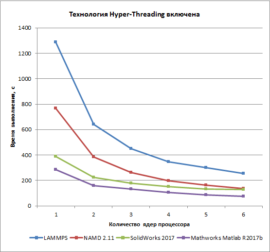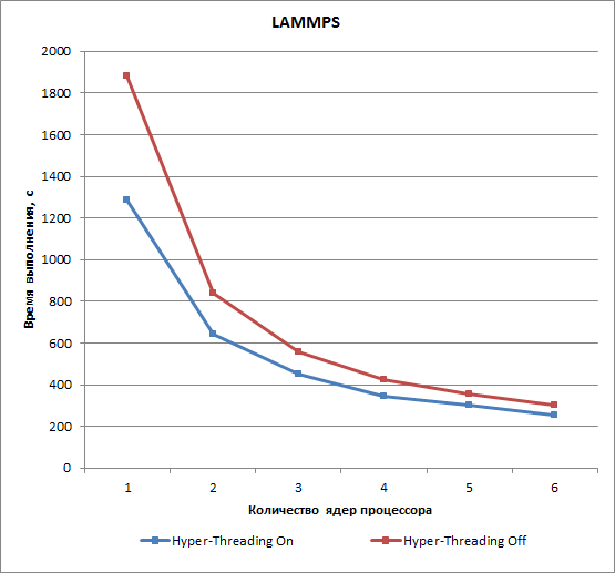 Для теста на основе приложения LAMMPS использование технологии Hyper-Threading позволяет сократить время расчета примерно на 30% в случае одного ядра и на 16% при шести ядрах процессора.