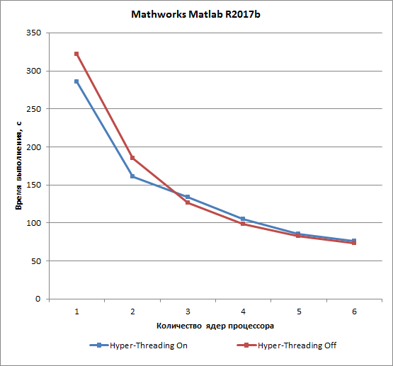 Расчет в приложении Mathworks Matlab R2017b вообще мало зависит от технологии Hyper-Threading. В варианте одного ядра процессора сокращение времени расчета составляет 10% при использовании технологии Hyper-Threading, а при числе ядер больше двух более заметного эффекта от использования технологии Hyper-Threading не наблюдается.