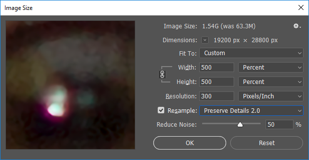 Кроме того, для приложения Photoshop CC 2018 мы добавили еще один тест: увеличение размера фотографии (масштабирование до 500%) с использованием нового алгоритма Resampling, называемого Preserve Details 2.0 (в предыдущей версии Photoshop этот алгоритм отсутствовал). При выборе Preserve Details 2.0 можно дополнительно задать уровень шумоподавления (Reduce Noise). Мы использовали в тесте шумоподавление 50%.