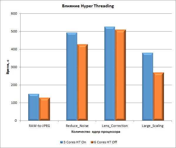 Мы решили еще немного поэкспериментировать с технологией Hyper-Threading, отключив ее и меняя количество ядер процессора от одного до шести. Учитывая, что тест Shake Reduction на процессоре без технологии Hyper-Threading может длиться аномально долго, мы ограничились обработкой одной фотографии.