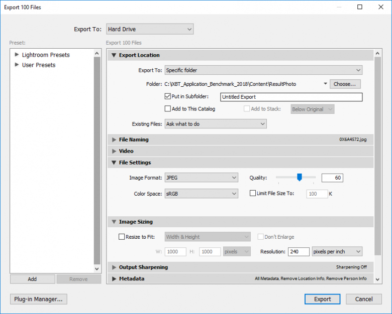 В тесте с приложением Adobe Photoshop Lightroom Classic СС 2018 мы используем тот же самый набор фотографий, что и в тесте с приложением Adobe Photoshop СС 2018, то есть 100 фотографий в формате RAW, снятых камерой Canon EOS 5D Mark III с объективом Canon EF 50 mm f/1.2L USM. Разрешение каждой фотографии составляет 3840×5760.