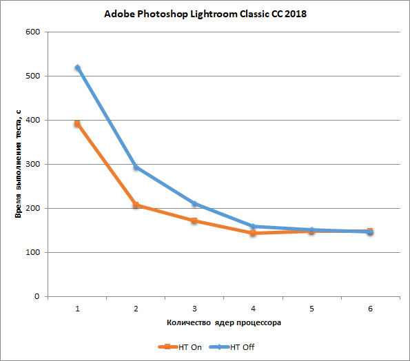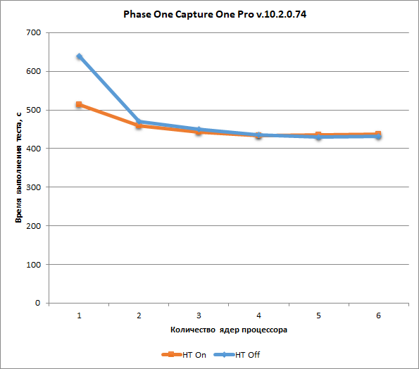 Тот факт, что результат теста на основе приложения Phase One Capture One Pro v.10.2.0.74 почти не зависит от количества ядер процессора, вполне логичен. Напомним, что результат теста на 84% зависит от времени экспорта в формат JPEG. А данный процесс, хотя и распараллеливается на все доступные ядра процессора, очень слабо их загружает.