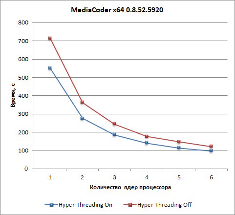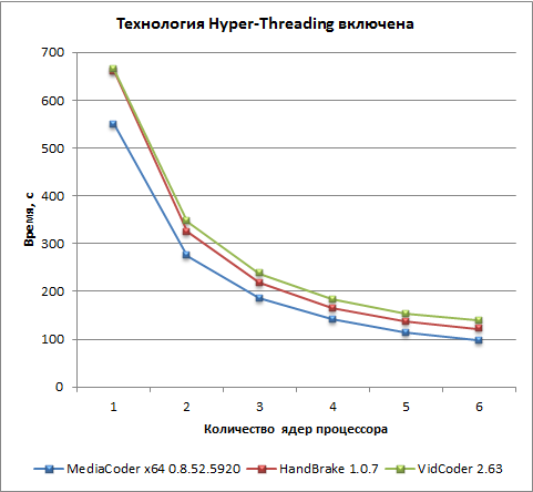 Для теста на основе приложения MediaCoder использование технологии Hyper-Threading позволяет сократить время видеоконвертирования примерно на 20% при любом (от 1 до 6) числе ядер процессора.