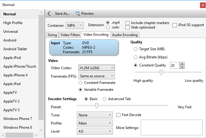 HandBrake — это бесплатный видеоконвертер из любого формата видео с открытым исходным кодом. Есть версии для macOS, Windows и Linux. Для Windows имеются 32-битная и 64-битная версия программы. Утилита содержит огромное количество различных пресетов конвертирования (например, под устройства Apple iPod, iPhone, iPad, Apple TV, Android и др.), а также позволяет задавать параметры конвертирования вручную.