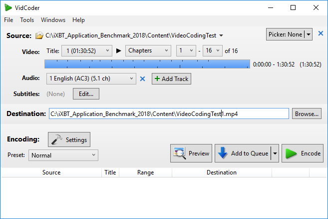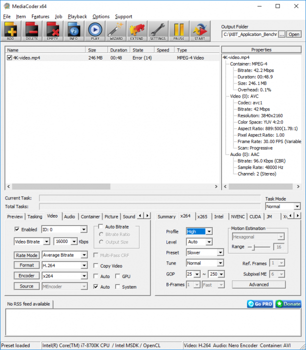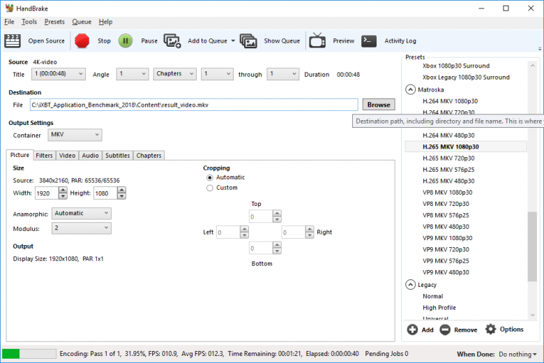 При тестировании мы используем тот же 4K-видеофайл, что и в случае программы HandBrake. Исходный видеофайл конвертируется c использованием кодека H.264 (x264) в контейнер AVI с уменьшением размера кадра до 1920×1080 и уменьшением видеобитрейта до 16 Мбит/с.