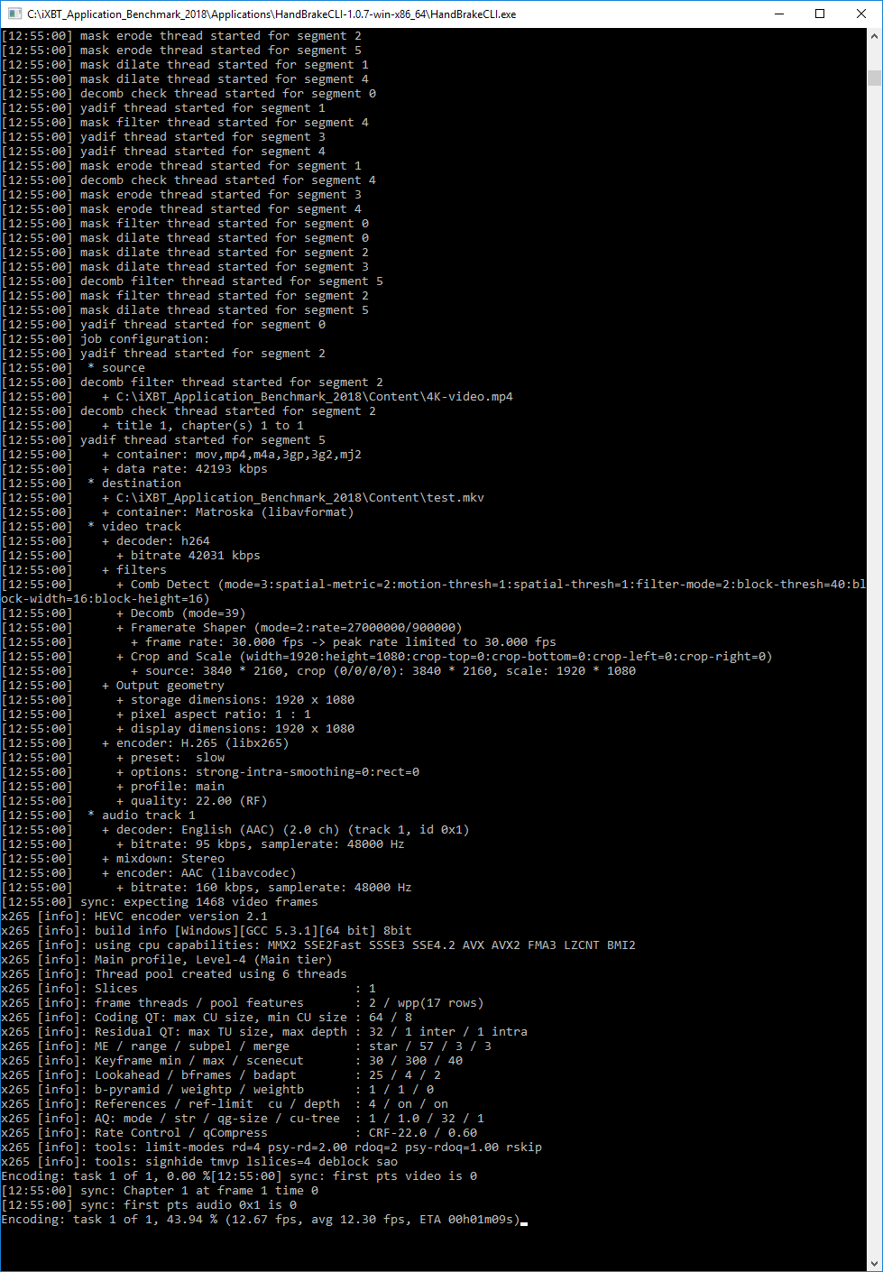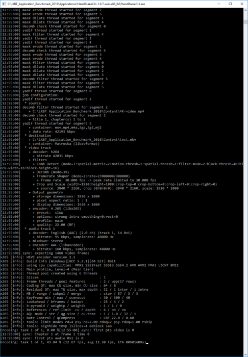 Помимо программы HandBrake с графическим интерфейсом, есть версия HandBrake для командной строки (опять-таки, есть 32-битная и 64-битная версия). По своим возможностям версия для командной строки ничем не отличается от версии с GUI (графическим интерфейсом), но для реализации теста запуск программы из командной строки более удобен. Именно поэтому в нашем тестовом пакете мы используем версию HandBrake 1.0.7 для командной строки.