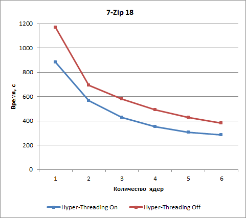 Для теста на основе приложения 7-Zip 18 использование технологии Hyper-Threading сокращает время архивации примерно на 25%.