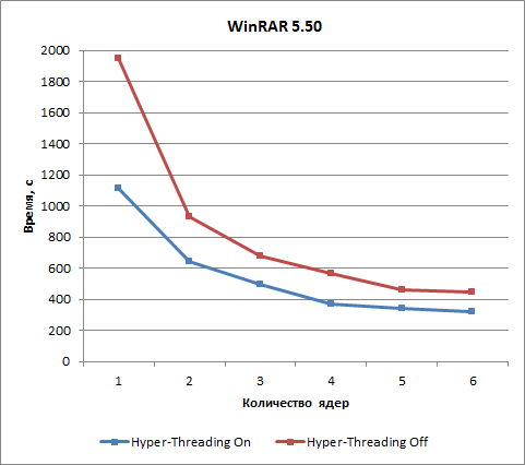 Для теста на основе приложения WinRAR 5.50 использование технологии Hyper-Threading позволяет сократить время архивации примерно на 30% при числе ядер процессора от двух до шести, а в случае одного ядра время сокращается на 42%.