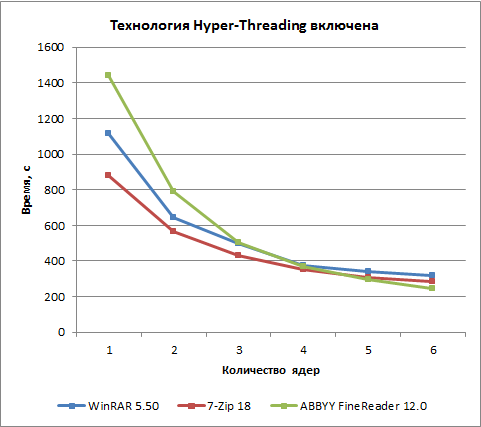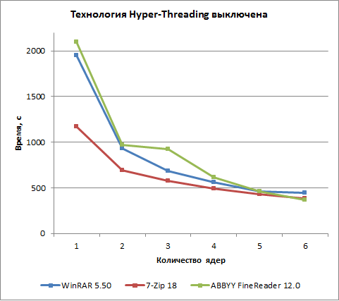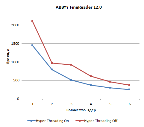 В приложении Abbyy FineReader 12.0, как уже отмечалось, при отключении технологии Hyper-Threading результаты получаются довольно странные. Поэтому скажем так: технология Hyper-Threading в данном случае позволяет существенно улучшить результаты (сократить время теста). При шести ядрах процессора сокращение времени составляет 33%.