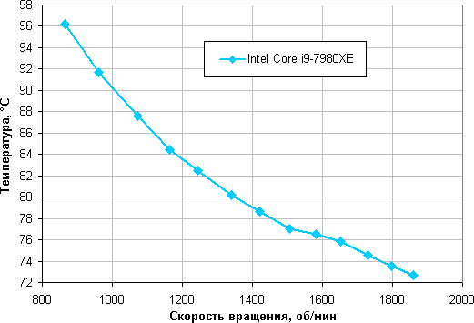 При КЗ = 45% (примерно 960 об/мин) в данных условиях кулер уже не справляется с охлаждением процессора Intel Core i9-7980XE, так как температура отдельных ядер достигает 98 °C (максимальная температура, допустимая на кристалле процессора, равна 94 °C).