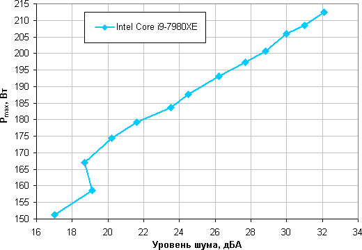 Приняв 25 дБА за критерий условной бесшумности, получим примерную максимальную мощность процессоров, соответствующих этому уровню. Это порядка 190 Вт для процессора Intel Core i9-7980XE. Если не обращать внимания на уровень шума, то пределы мощности можно увеличить где-то до 210 Вт. Еще раз уточним, это в жестких условиях обдува радиатора нагретым до 44 градусов воздухом, при снижении температуры воздуха указанные пределы мощности для бесшумной работы и максимальной мощности возрастают.