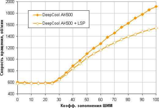 Хороший результат — плавный рост скорости вращения при изменении коэффициента заполнения (КЗ) от 25% до 100% и довольно широкий диапазон регулировки. Отметим, что при КЗ 0% вентилятор не останавливается, поэтому в гибридной системе охлаждения с пассивным режимом на минимальной нагрузке такие вентиляторы придется останавливать, снижая напряжение питания. Вставка LSP заметно снижает максимальную скорость вращения, но мало влияет на минимальную.