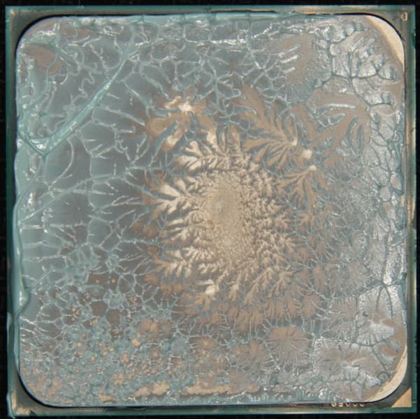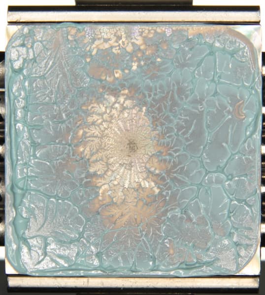 Видно, что термопаста распределилась тонким слоем практически по всей плоскости крышки процессора, а ее избыток выдавился по краям. Пятно плотного контакта находится в центральной части теплосъемника, и в данном случае это хорошо. Впрочем, крышка данного процессора не идеально плоская, а заметно выпуклая в центре.