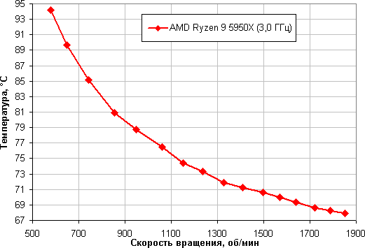 По факту в условиях теста этот процессор при 24 градусах окружающего воздуха перегревается при КЗ равном 25% (а это примерно 580 об/мин вентиляторов), так как максимальная температура для AMD Ryzen 9 5950X равна 90 °C.