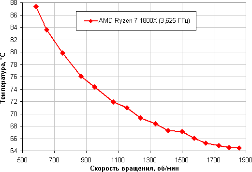 По факту в условиях теста этот процессор при 24 градусах окружающего воздуха не перегревается даже при КЗ равном 25% (а это примерно 580 об/мин вентиляторов), так как максимальная температура для AMD Ryzen 7 1800X равна 95 °C.