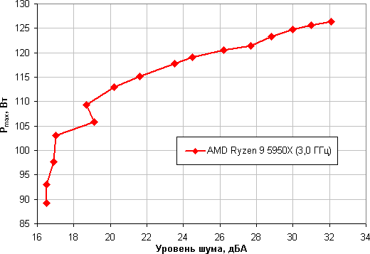 Приняв 25 дБА за критерий условной бесшумности, получим, что максимальная мощность процессора, соответствующая этому уровню, составляет порядка 119 Вт. Если не обращать внимания на уровень шума, то предел мощности можно увеличить где-то до 126 Вт. Еще раз уточним: это в жестких условиях обдува радиатора нагретым до 44 градусов воздухом. При снижении температуры воздуха указанные пределы мощности для бесшумной работы и максимальной мощности возрастают. Поэтому при условии достаточно хорошей вентиляции в корпусе данный кулер как-то справится с охлаждением процессора AMD Ryzen 9 5950X, но на возможность существенного разгона рассчитывать уже не стоит.