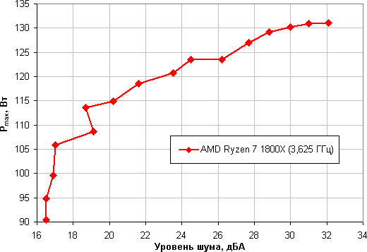 Приняв 25 дБА за критерий условной бесшумности, получим, что максимальная мощность процессора, соответствующая этому уровню, составляет порядка 123 Вт. Если не обращать внимания на уровень шума, то предел мощности можно увеличить где-то до 131 Вт. Еще раз уточним: это в жестких условиях обдува радиатора нагретым до 44 градусов воздухом. При снижении температуры воздуха указанные пределы мощности для бесшумной работы и максимальной мощности возрастают. Поэтому при условии достаточно хорошей вентиляции в корпусе данный кулер должен справится с охлаждением процессора AMD Ryzen 7 1800X.
