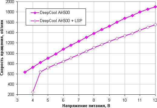 Диапазон регулировки с помощью напряжения примерно такой же. Вентилятор останавливается при снижении напряжения до 3,3 В и запускается от 3,4 В (с LSP — 3,4 В и 5,0 В соответственно). Вентилятор без вставки LSP вполне допустимо подключать к источнику с напряжением 5 В.