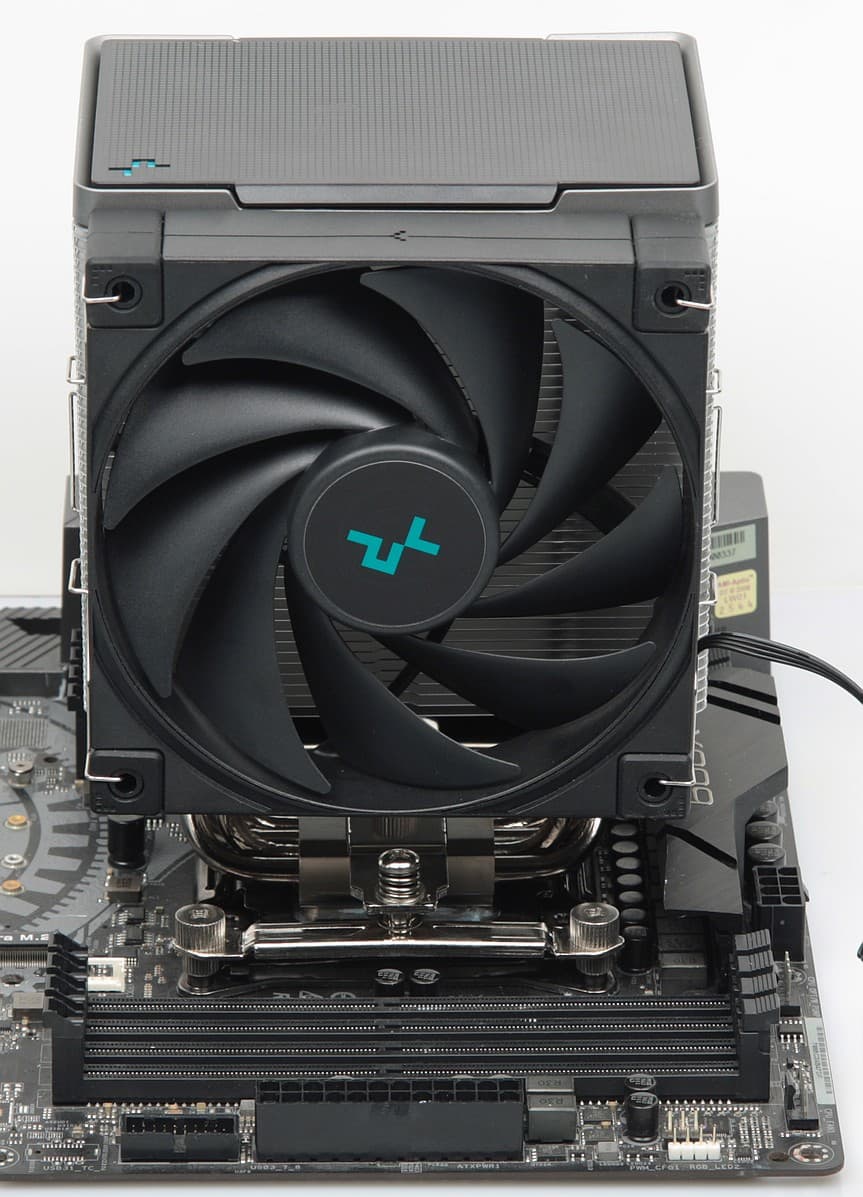 На основе кулера DeepCool AK500 можно создать условно бесшумный компьютер (уровень шума 25 дБА и ниже), оснащенный процессором типа Intel Core i9-7980XE (Intel LGA2066, Skylake-X (HCC)), если потребление процессора под максимальной нагрузкой не будет превышать 190 Вт, а температура внутри корпуса не повысится выше 44 °C. В случае чиплетного процессора AMD Ryzen 9 5950X эффективность кулера заметно ниже, и для соблюдения указанных выше условий максимальная мощность, потребляемая процессором, должна быть не выше 119 Вт, а в случае AMD Ryzen 7 1800X — 123 Вт. Для процессора Intel Core i9-13900K значение следующее – 160 Вт. При снижении температуры охлаждающего воздуха и/или менее жестких требованиях к уровню шума пределы мощности во всех трех случаях можно увеличить. К достоинствам кулера следует отнести аккуратный дизайн, удобную установку и то, что он не перекрывает слоты для модулей памяти со стороны вентилятора, а с другой стороны позволяет установить модули высотой до 50 мм.