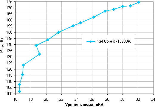 Попробуем уйти от условий тестового стенда к более реалистичным сценариям. Допустим, что температура воздуха, забираемого вентилятором системы охлаждения, может повышаться до 44 °C, но температуру процессора под максимальной нагрузкой не хочется повышать выше 80 °C. Ограничившись этими условиями, построим зависимость реальной максимальной мощности (обозначенной как Pmax (ранее мы использовали обозначение Макс. TDP)), потребляемой процессором, от уровня шума (подробности описаны в методике):