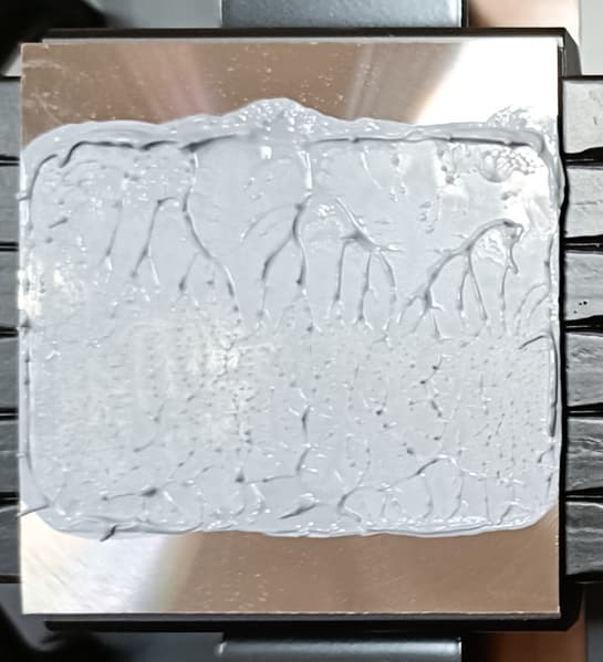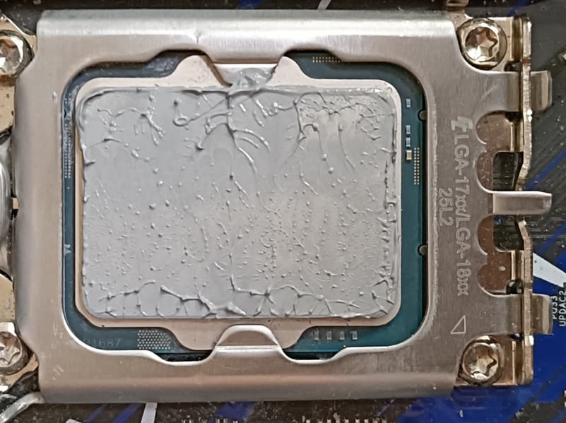 Видно, что термопаста распределилась тонким слоем по всей плоскости крышки процессора, а ее избыток выдавился по краям. Пятно плотного контакта большое.