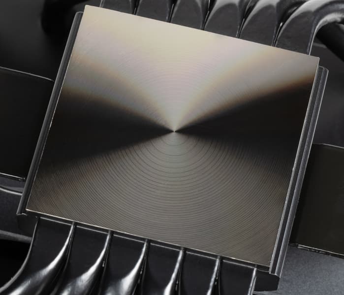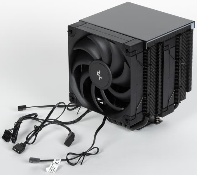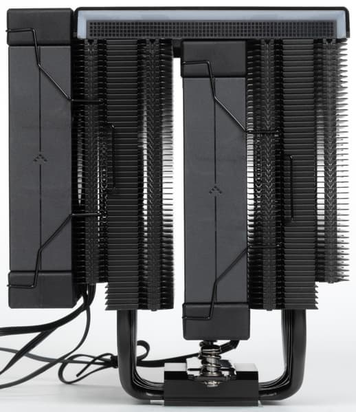 Кулер оснащен вынесенным двойным радиатором, к которому тепло от теплосъемника передается по шести тепловым трубкам диаметром 6 мм. Трубки и нижняя часть теплосъемника медные. Трубки, нерабочая поверхность теплосъемника, пластины радиатора и часть деталей крепежа имеют черное полуматовое лакокрасочное покрытие. В нашем случае черное, но в продаже уже доступна и радикально белая версия — обычно они появляются чуть позже. Верхняя часть теплосъемника изготовлена из алюминиевого сплава. Трубки к теплосъемнику припаяны. Подошва теплосъемника имеет очень мелкую концентрическую проточку и слегка отполирована. Поверхность подошвы немного выпуклая к центру с перепадом порядка 0,1-0,2 мм.