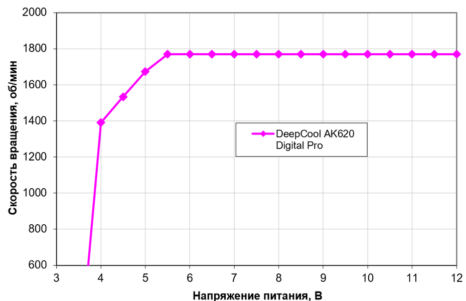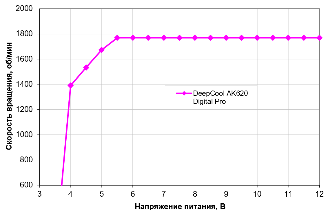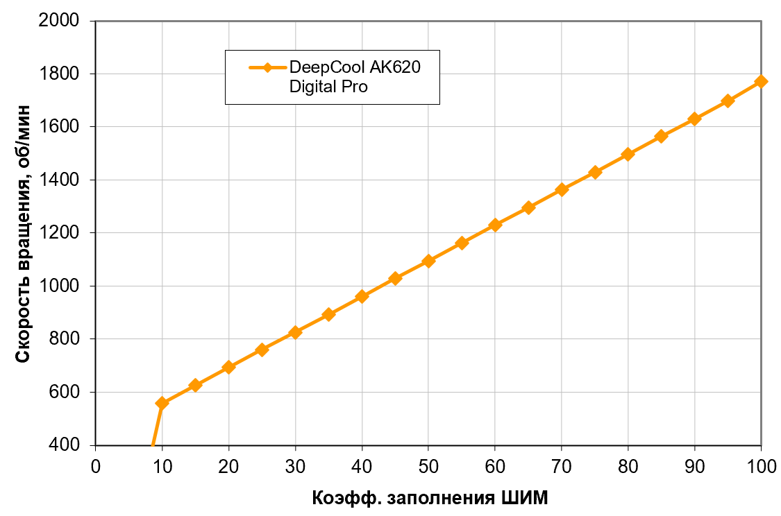 Отличный результат — монотонный и практически линейный рост скорости вращения при изменении коэффициента заполнения (КЗ) от 10% до 100% и довольно широкий диапазон регулировки. Отметим, что при КЗ 5% и ниже вентиляторы останавливаются, поэтому в гибридной системе охлаждения с пассивным режимом на минимальной нагрузке управлять ими можно не прибегая к регулировке напряжения.