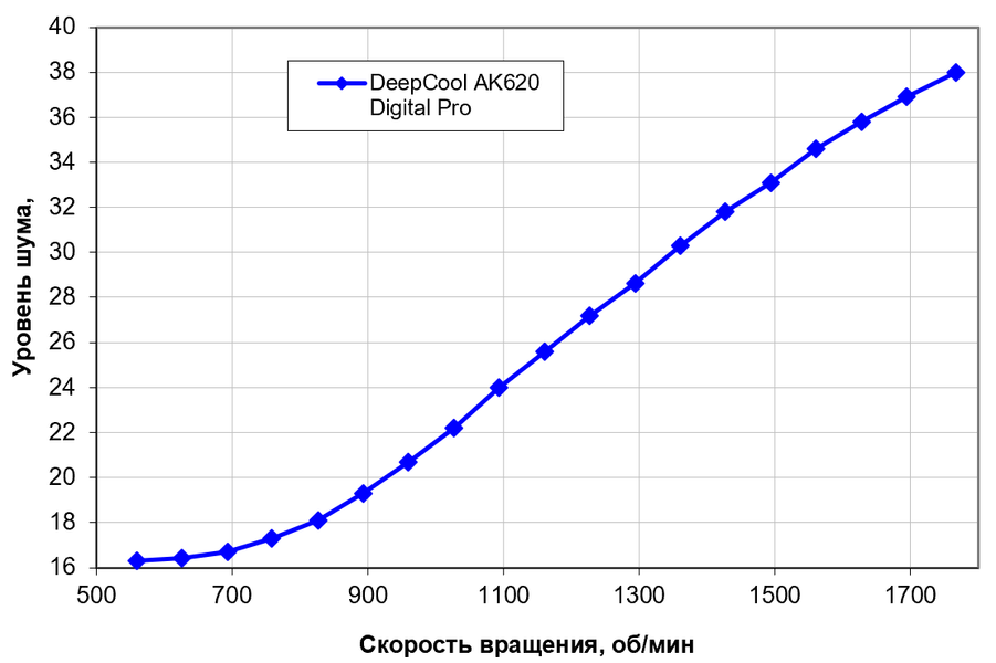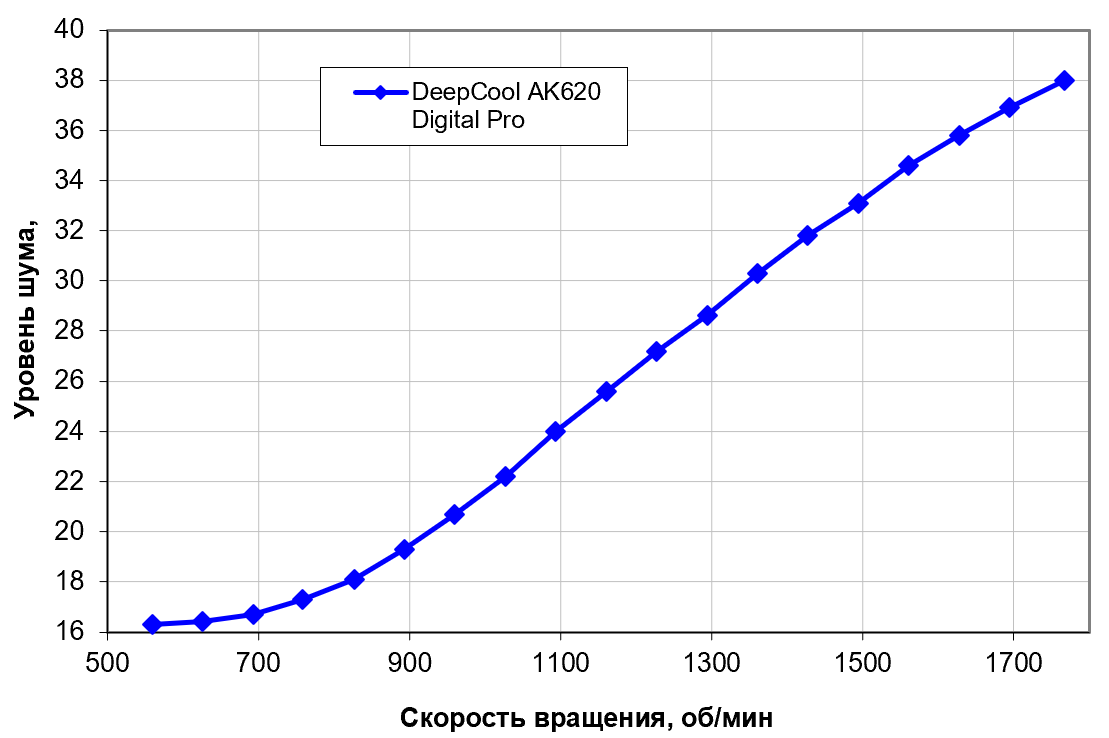 Зависит, конечно, от индивидуальных особенностей и других факторов, но в случае кулеров где-то от 40 дБА и выше шум с нашей точки зрения очень высокий для настольной системы, от 35 до 40 дБА уровень шума относится к разряду терпимых, ниже 35 дБА шум от системы охлаждения не будет сильно выделяться на фоне типичных небесшумных компонентов ПК — вентиляторов корпусных, на блоке питания, на видеокарте, а также жестких дисков, а где-то ниже 25 дБА кулер можно назвать условно бесшумным. Фоновый уровень был равен 16,1 дБА (условное значение, которое показывает шумомер). К нему мы стабильно приходим при отключении вентиляторов (естественно), но несложно заметить, что это не обязательно — работа на минимальных оборотах обеспечивает шум, практически не отличимый от фонового без приборов. А вот на максимуме вентиляторы слишком тихими не назовешь, но этого производитель и не обещал.