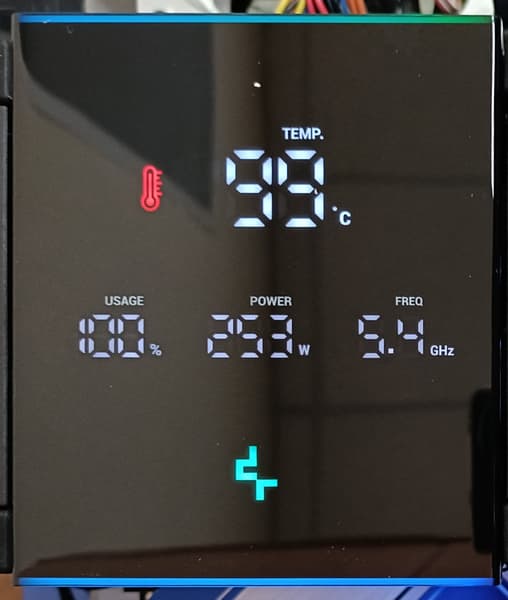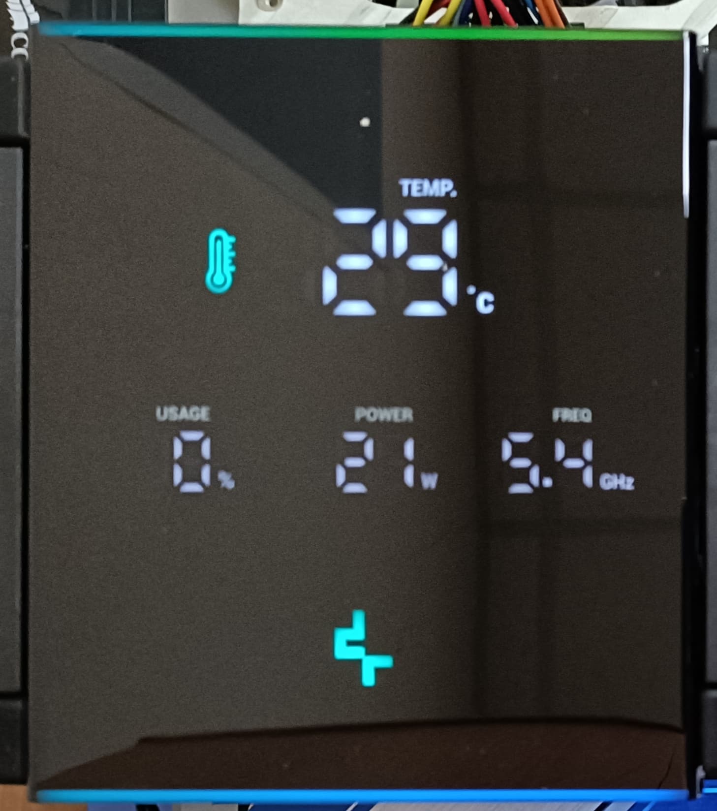 Сверху на радиаторе на магнитах закреплена декоративная пластиковая крышка. По бокам крышки есть декоративные вставки с подсветкой (типа ARGB), а в центре — информационная панель, на которую выводится текущая температура процессора в виде числа, значок термометра (меняет цвет при критическом нагреве), загрузка процессора, текущее энергопотребление по данным мониторинга и тактовая частота по ним же. Для управления подсветкой предлагается использовать системную плату или внешний контроллер, а вот для расширенной индикации необходимо подключить кулер к разъему USB 2.0 на плате (фактически отдав под это два порта, но их в настоящее время уже и не жалко) и установить небольшую утилиту.