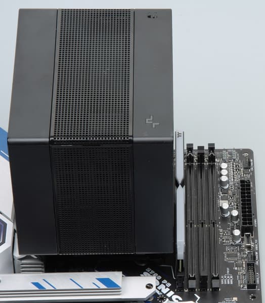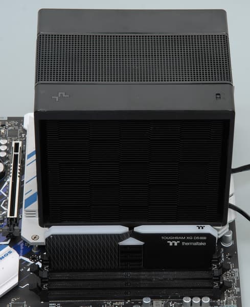 Габариты кулера довольно большие, но в случае большинства совместимых разъемов для процессоров Intel и, видимо, всех совместимых для процессоров AMD все разъемы для оперативной памяти сверху радиатором не перекрываются. Пример для LGA1700: